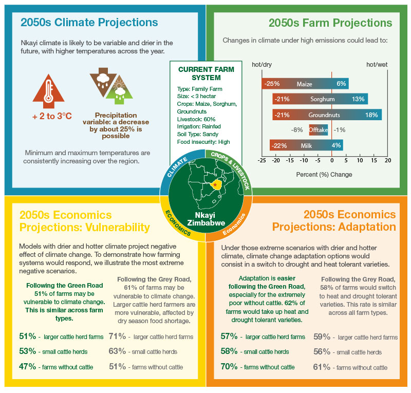 Stakeholders have emphasized that the time to begin equipping Nkayi farmers to face climate change is now. The project engaged provincial level stakeholders and farmers to design options for improving crop and livestock production. These options could be implemented within the next 5 years, if the right decisions were made to support farmers. Packages for improving crop and livestock management were designed and their impacts evaluated for three categories of farmers: Very poor (farm size 1.3 ha, no cattle); Poor (farm size 1.8 ha, 8 cattle or less), Better-off (farm size 2.5 ha, more than 8 cattle).